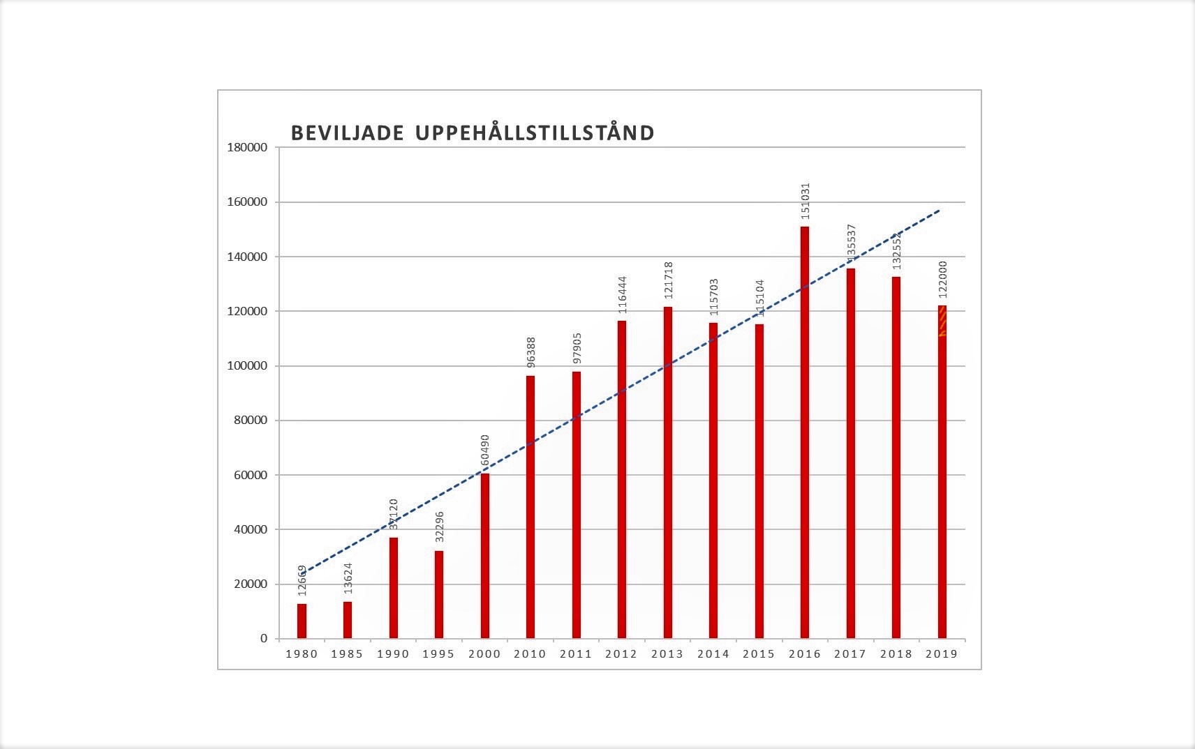 2019 kommer att bli ännu ett rekordår i antalet beviljade uppehållstillstånd. Fortsätter takten som hittills i år blir de 122.000 vilket blir det fjärde högsta någonsin.
