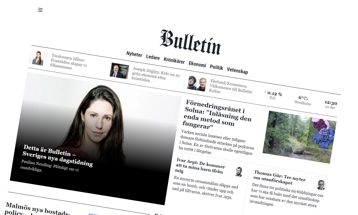 Nu har den nya dagstidningen Bulletin kommit ut med sina första artiklar på sin hemsida. Projektet har varit beryktat hela hösten, men nu kan vi se hur redaktionen själv formulerar sin position i svensk samhällsdebatt.