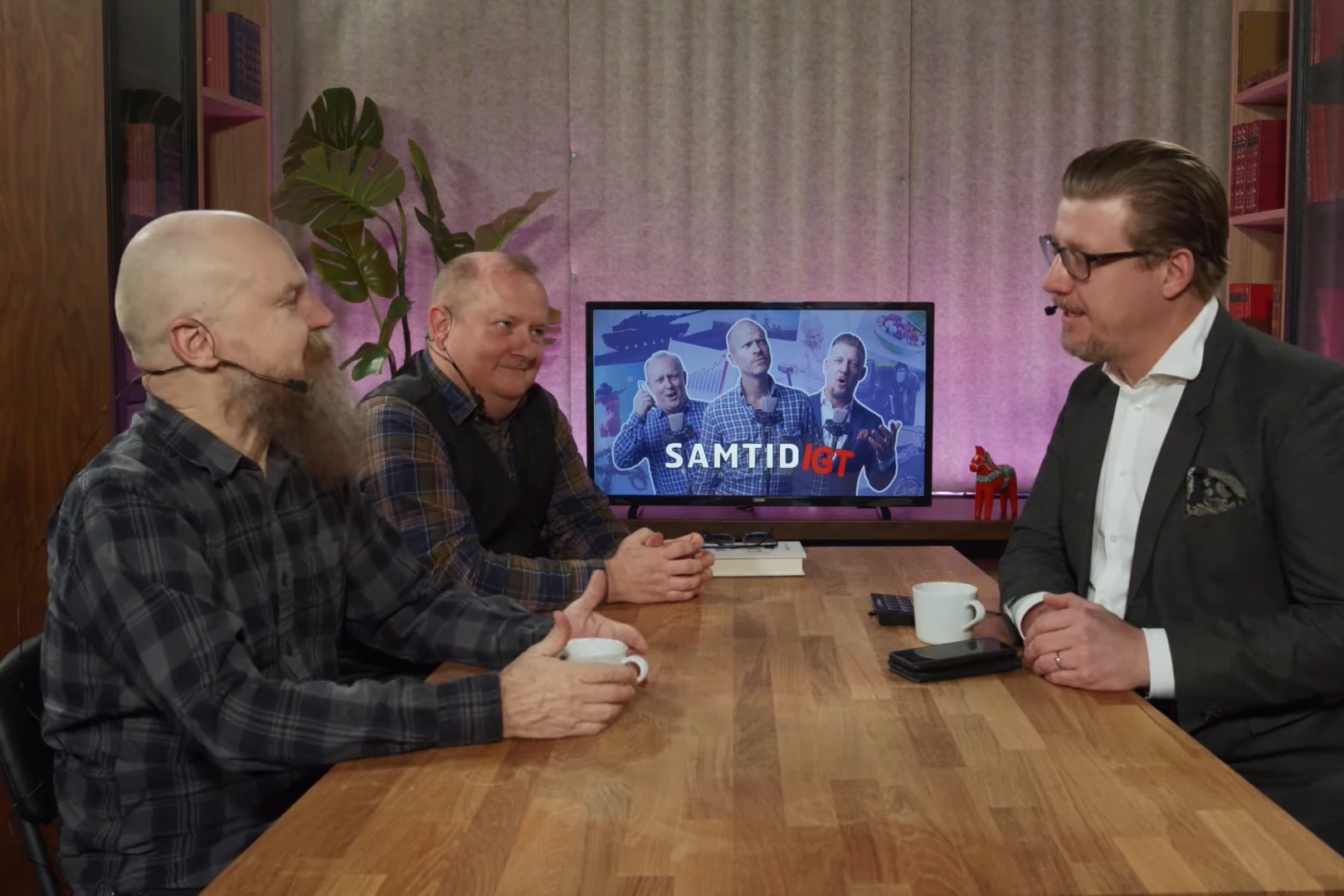 Medverkande i podden ”Samtidigt”: Dick Erixon (Samtiden) och Linus Bylund (Sverigedemokraterna) samt Alexander Bard (gäst). Frånvarande denna vecka: Erik Dahlin.
