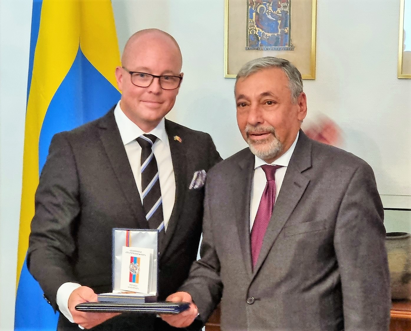 Vid en mottagning på Armeniens ambassad i Stockholm mottog Björn Söder medaljen tidigare i veckan av ambassadör Alexander Arzoumanian.