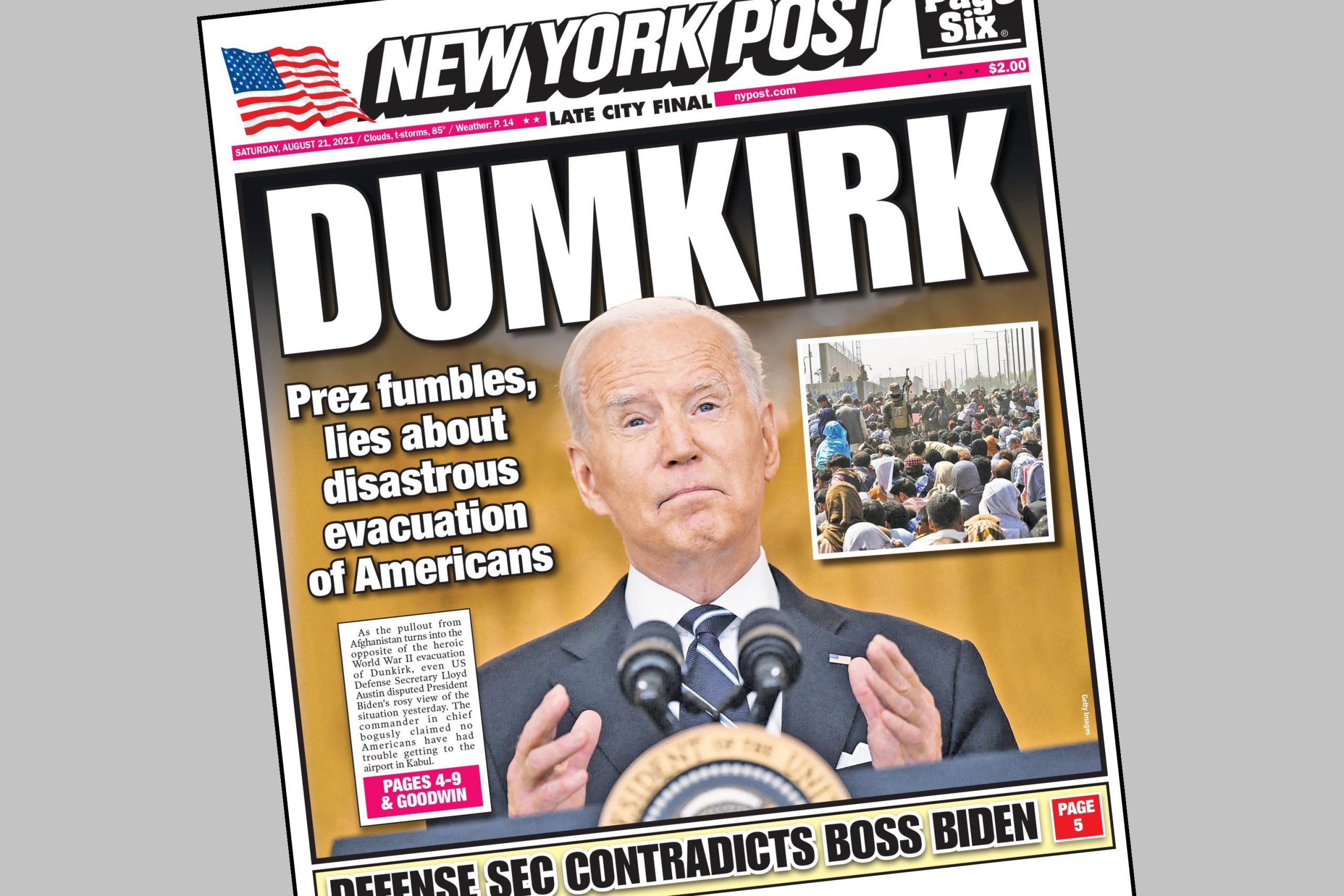 Tidningen skriver ”Det är svårt att i ord fånga hur skamligt allt detta är. Varför skapar inte militären en säker korridor för amerikaner? Varför ger vi upp mot talibanerna? Nej, inte bara ge upp – kapitulerar. Genom att attackera amerikaner bryter de mot avtal Biden säger att han har med dem. Ambassaden säger att hot från IS gör det osäkert att åka till flygplatsen – varför ger talibanerna IS möjlighet att verka i landet? Det borde ske en massiv mobilisering för att säkerställa en säker utresa.”