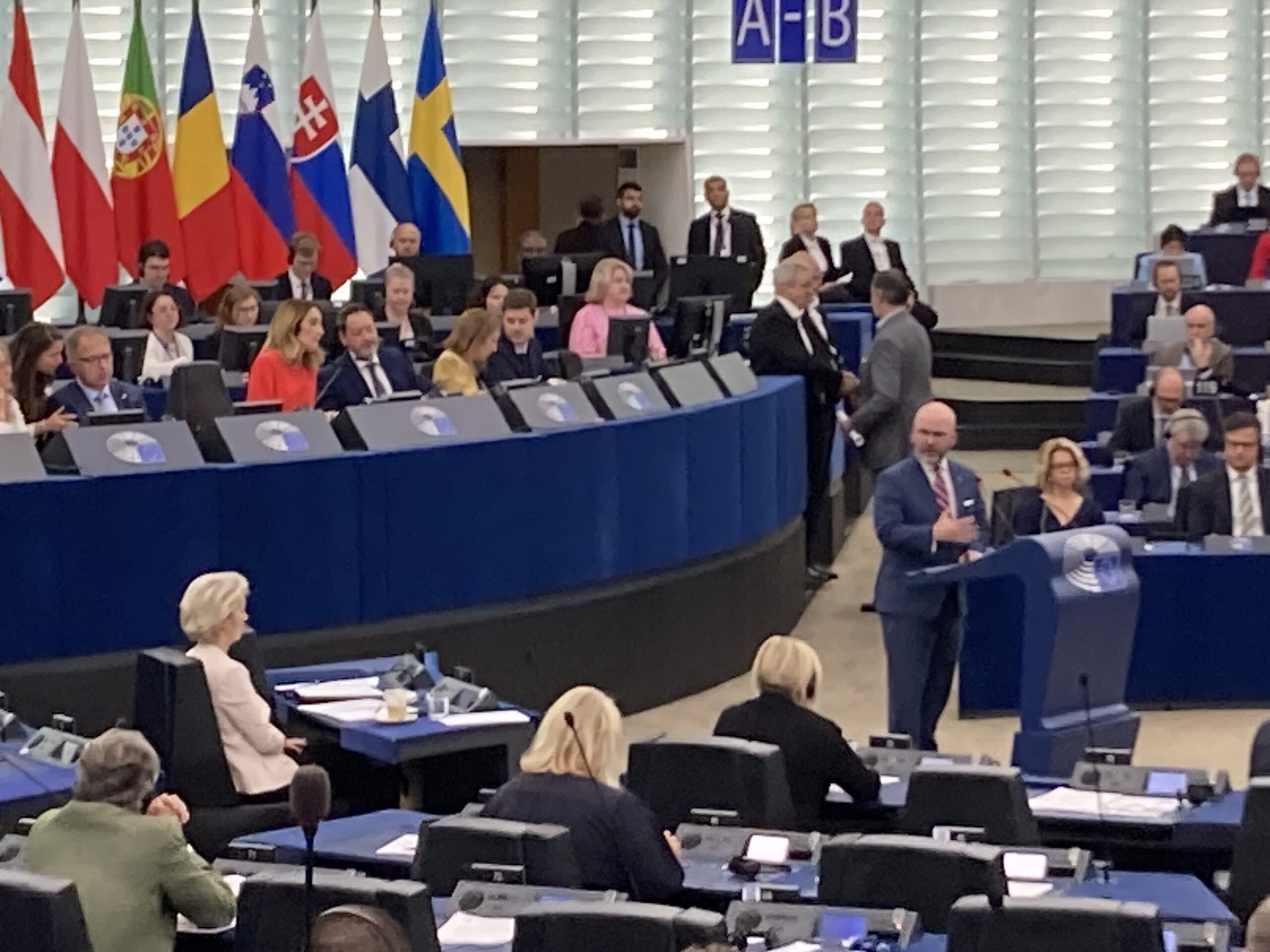 Inför omröstningen gav Charlie Weimers en röstförklaring (se den framföras här) och i plenisalen riktade han sig direkt till Ursula von der Leyen som satt på första raden.