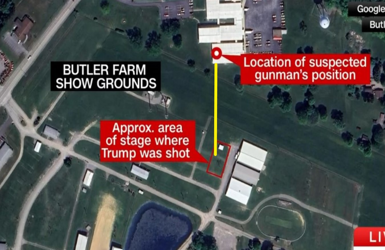 Det är naturligtvis svårt att övervaka ett valmöte som hålls utomhus inför tiotusentals deltagare. Det blir stora arealer att ha kontroll på. Men det som verkligen gör det märkligt är att attentatsmannen fanns på det allra närmaste hustaket framför Donald Trumps scen. Det närmsta! Så bilden ovan.