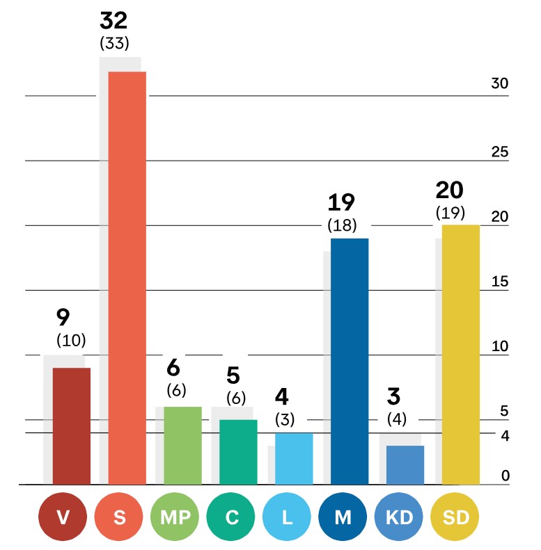 Socialdemokraterna, Vänsterpartiet och Centerpartiet backar med en procentenhet vardera. Miljöpartiet står stilla – och därmed är deras framgång från EU-valet utraderad.